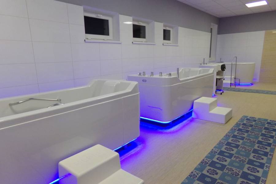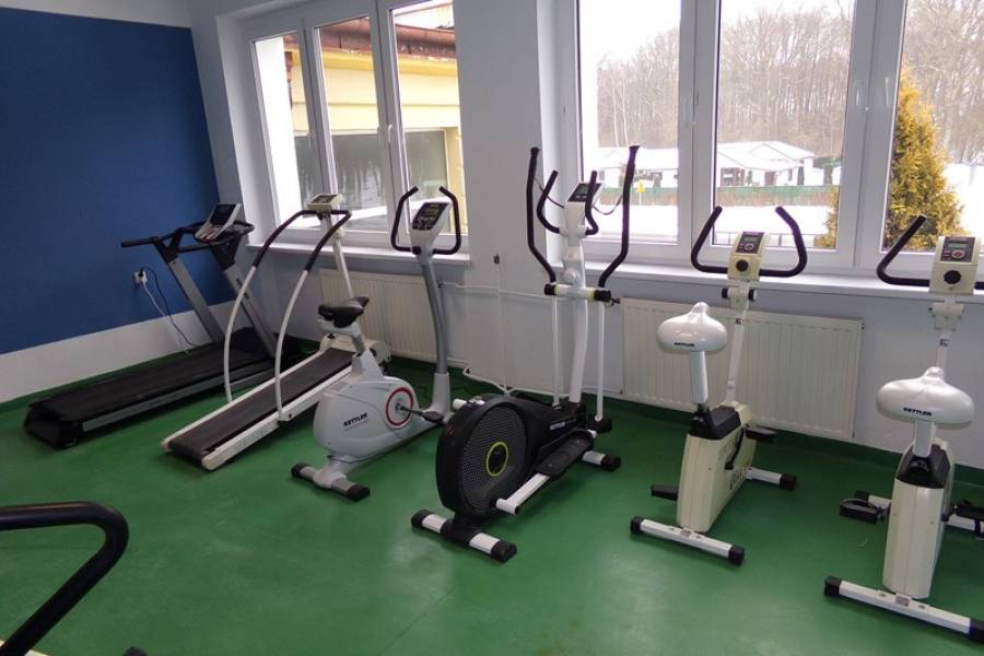 - sala rehabilitacyjna do ćwiczeń zespołowych wyposażona w ATLAS czterostanowiskowy, rowery treningowe, pas wibracyjny, bieżnię mechaniczną, stepper, wioślarz, wanny do hydromasażu