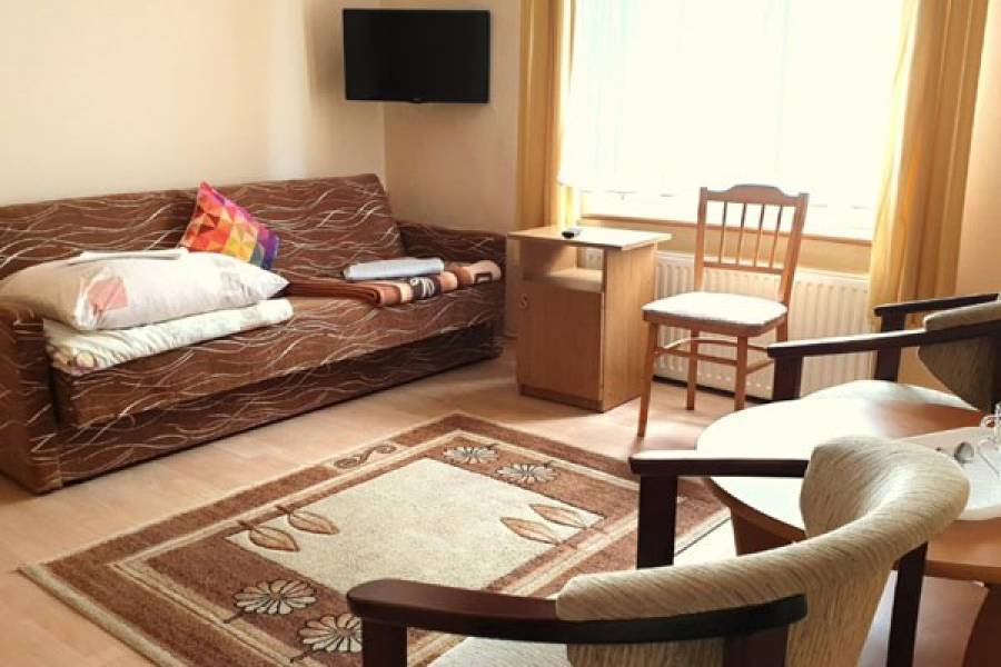 Hotelowiec dwupoziomowy. Do dyspozycji 46 miejsc w pokojach 2, 3, 4 osobowych. Wszystkie z łazienkami i telewizorami. Na parterze - sala kominkowa, sala taneczna, gabinet zabiegowy, kuchnia i jadalnia na 48 miejsc.
