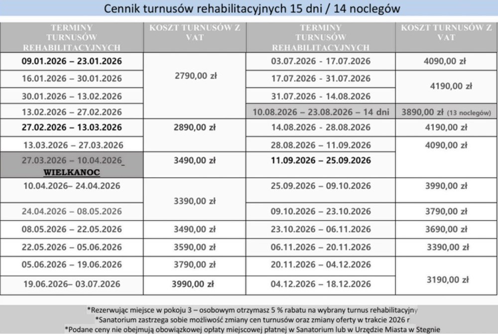 Oferta ma charakter informacyjny. Aktualne ceny, terminy i dostępność należy potwierdzić w recepcji sanatorium. Zastrzegamy możliwość zmian w ofercie.