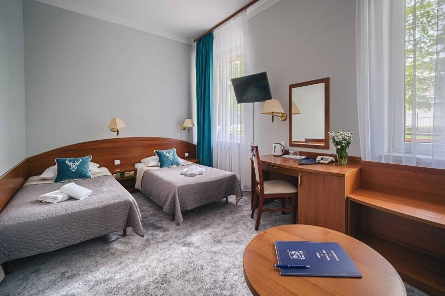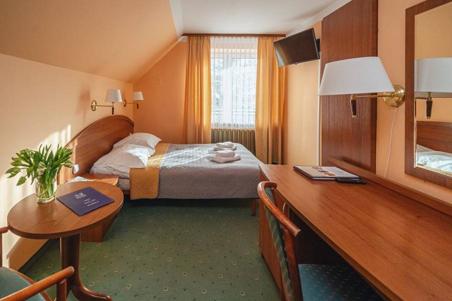 83 standardowo wyposażonych, przestronnych pokoi, w tym studia i apartamenty oraz pokoi DELUXE, 2 sale restauracyjne (dla 120 i 40 osób), 3 sale konferencyjne (dla 140, 50 i 40 osób), ogródek letni na tarasie, altanę grillową, ogród z placem zabaw, siłownia zewnętrzna, pokój zabaw dla dzieci. Bezpłatny i bezprzewodowy dostęp do Internetu. Bezpłatny parking.